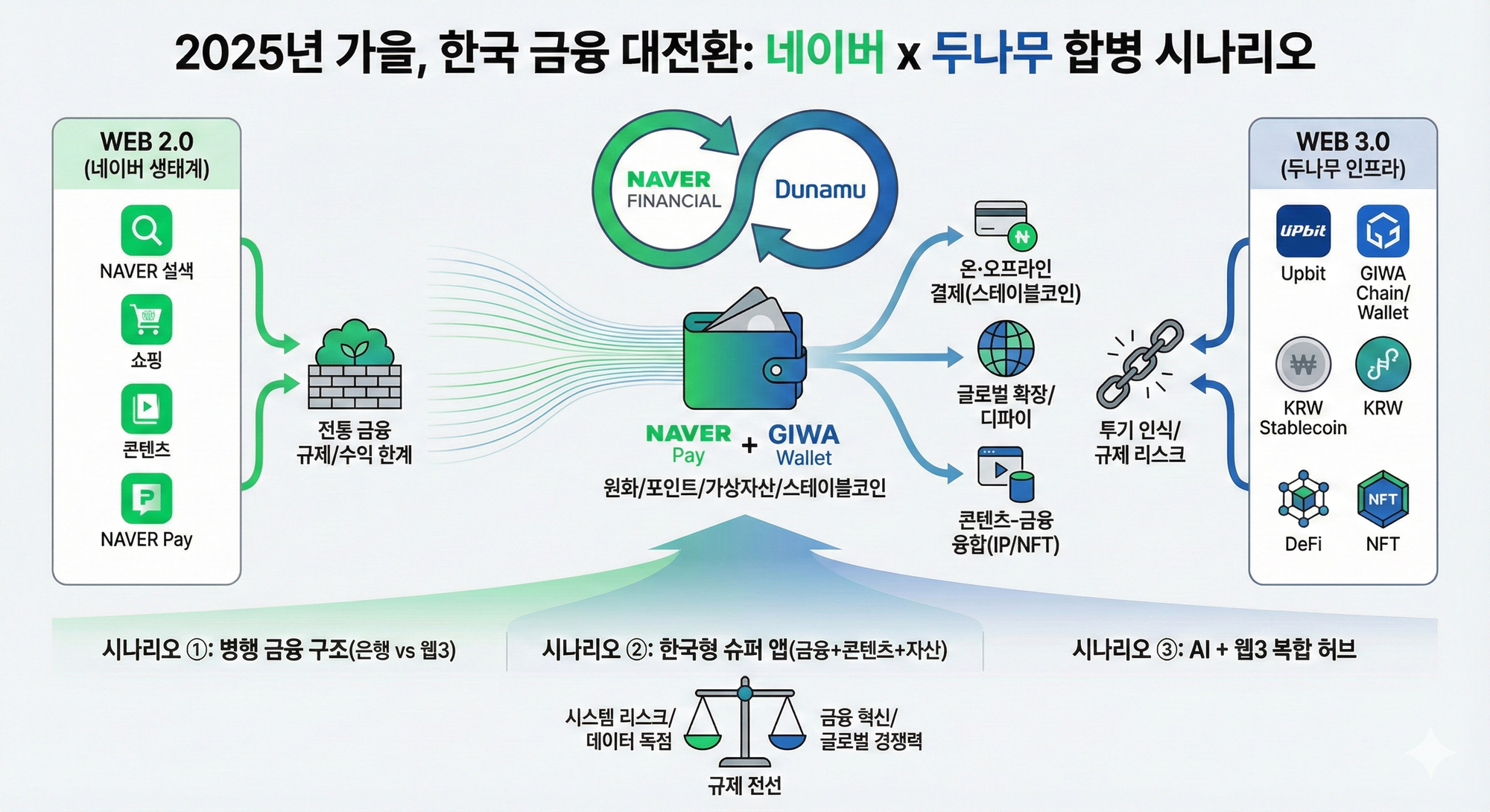 네이버–두나무 합병이 현실화되고, 스테이블코인·웹3 인프라가 상용화될 경우,